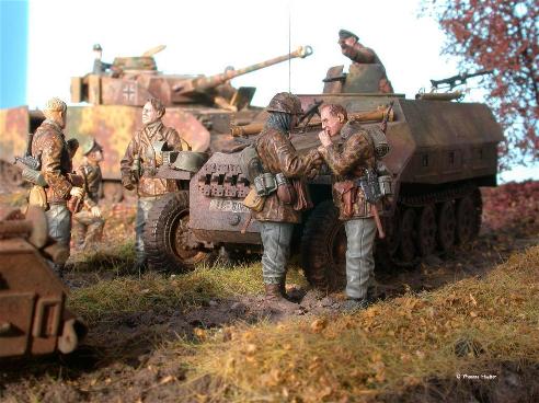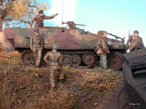 - Der Kommandant des Sdkfz. 251 stammt von Dragons „Wiking“-Set und erhielt einen Corée-Kopf. Er trägt Hose und Jacke im „Rauchmuster“.
