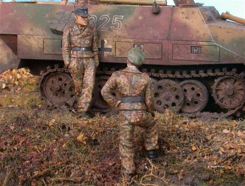 - Die Oberbekleidung der rastenden Infanteristen besteht aus Feldjacken Modell `43 bzw. der SS-Tarnschlupfjacke im „Erbsenmuster“ und zeigt jeweils deren Herbstvariante -