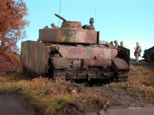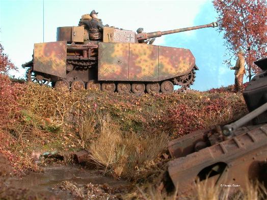- Der Panzer IV Ausf. H von Tamiya im "Hinterhalt-Tarnmuster". Die Schürzen wurden dort, wo die Materialstärke deutlich sichtbar ist, gegen Eigenbauten aus 0,5 mm Plastic-Sheet ausgetauscht -
