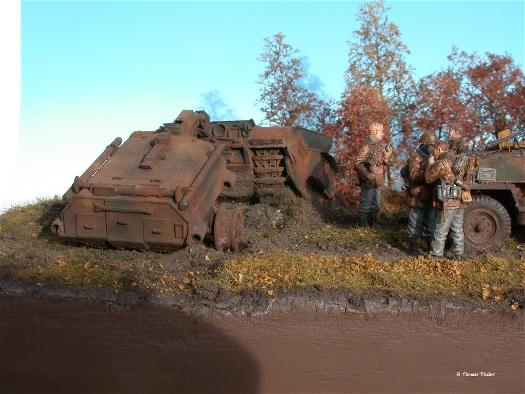 Das Jahr 1944 neigt sich langsam dem Ende, es ist deutlich kühler geworden. Die Lage der deutschen Truppen im Westen beginnt aussichtslos zu werden. Doch an diesem Tag regnet es endlich einmal nicht, sogar die Sonne ist zum Vorschein gekommen und wärmt die abgekämpften Protagonisten. Das Wrack des Churchill, das den Weg versperrt, verschafft den Infanteristen eine will-kommene Atempause, während die Offiziere das weitere Vorgehen abstimmen.